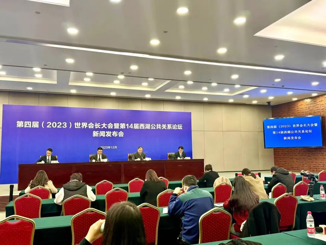 2023年12月7日下午,“第四届(2023)世界会长大会暨第14届西湖公共关系论坛”新闻发布会在杭州召开。会上举办单位宣布,本届大会将于2023年12月9日至10日在杭州举办。由中国人民对外友好协会、工业和信息化部国际经济技术合作交流中心、中国社会工作者联合会以及杭州市人民政府共同主办,杭州市公共关系协会承办,杭州市上城、拱墅、西湖、萧山、余杭、钱塘、临平等七个区人民政府、杭州市工商联,以及世界各地数百家社会组织联合承办,中国国际公共关系协会等单位作为支持单位。